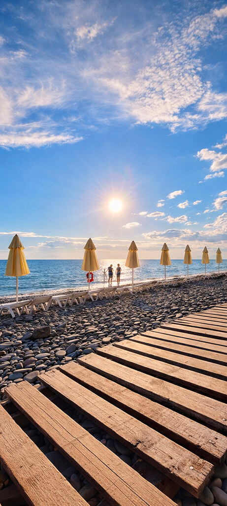 Дорога на пляж ровная, выход на море широкий, удобный, без перехода через железнодорожное полотно.
